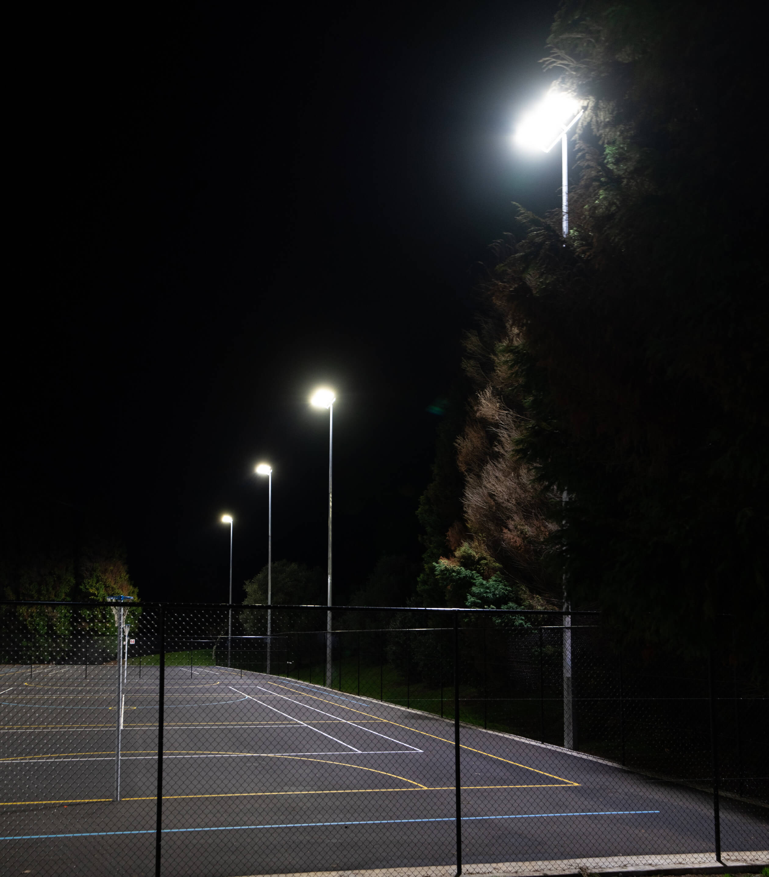 Energy Services established site power supplies, trenched & layed all cabling. (Some through existing ashpalt courts). Assembly and installation of 14.7m poles and luminaires. Livening & testing.